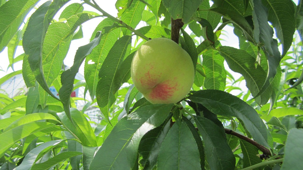 品種日川白鳳の頭が色付き始めました、真っ赤になりましたら出荷が始まります。
