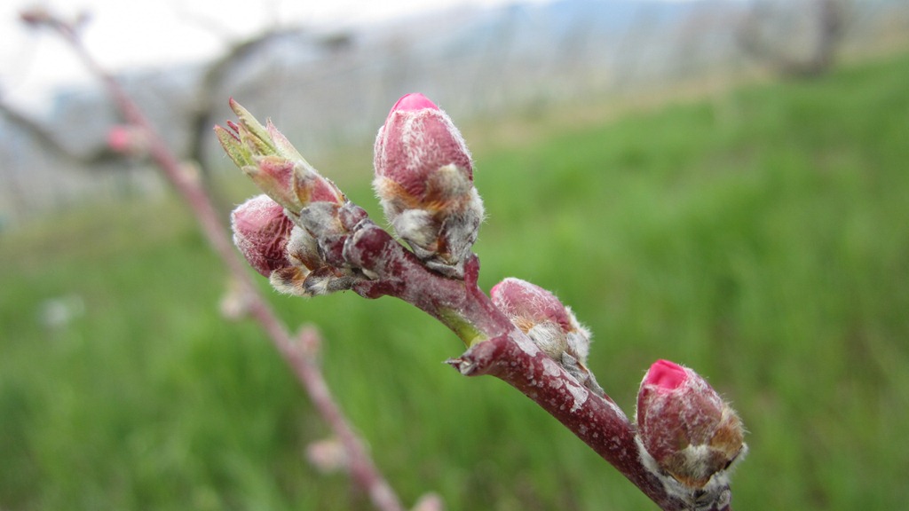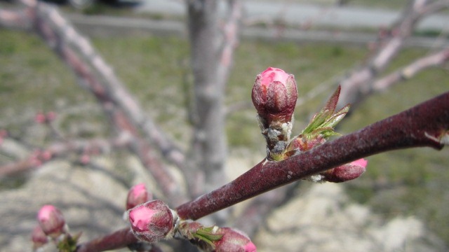4月10日桃の蕾はピンク色になりました、蕾ですがピンク色がはっきり見えます。