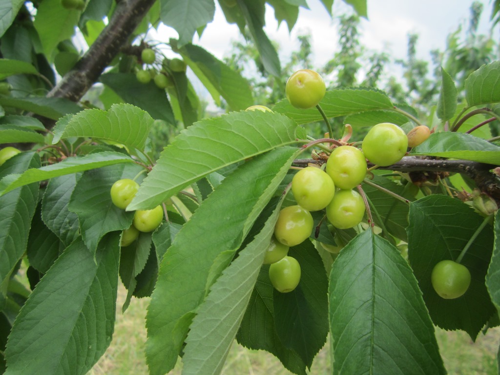 さくらんぼの実が青く、まだ固い