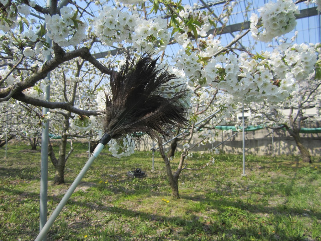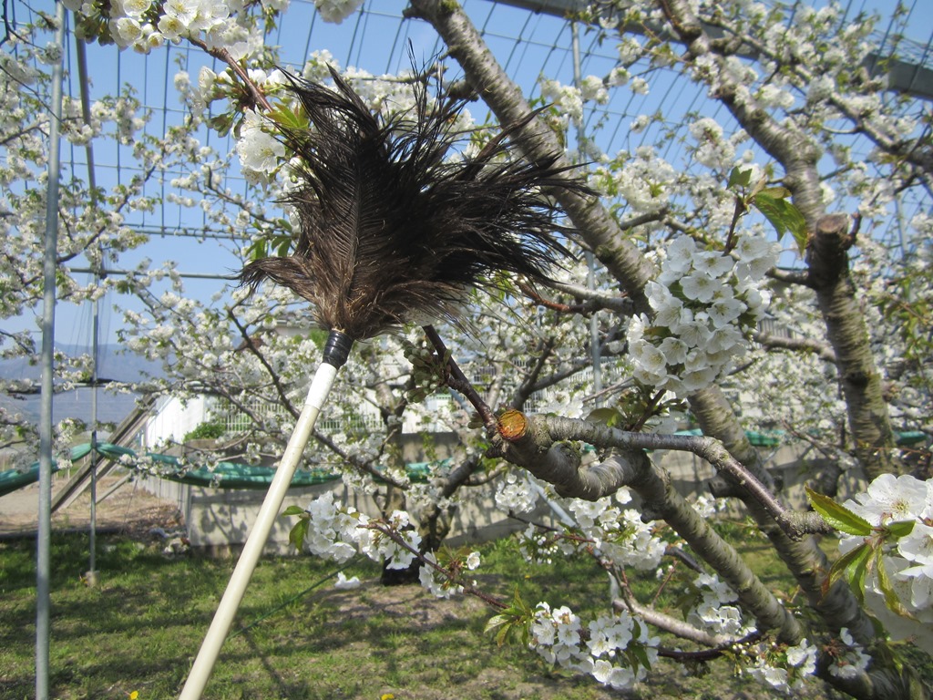 人工授粉の様子、周りにはミツバチがぶんぶんと飛び回っています。