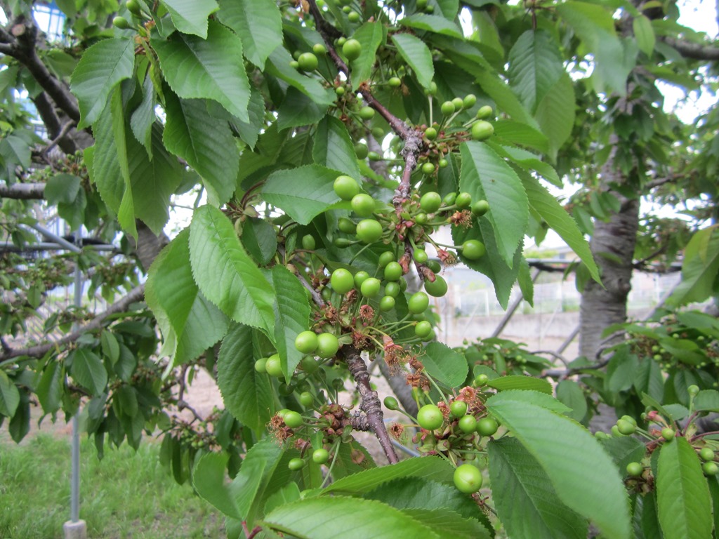 佐藤錦 : 花の時期の天候が良く、ミツバチの飛んでいる数が例年より多かった為か、実の付きがよさそうです。今の所、このままいくと、豊作になるかもしれない。