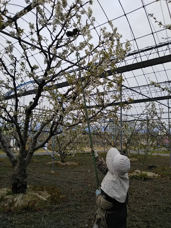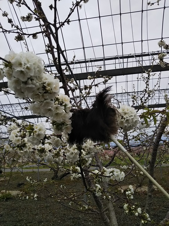 高砂は満開になりましたが、右写真の佐藤錦は2~3分咲きです。ケバタキで授粉作業を毎日行っています。今年は霜と冷害で不作かも???特に高砂は花芽が少ない。